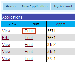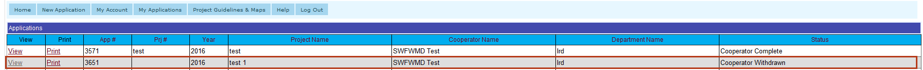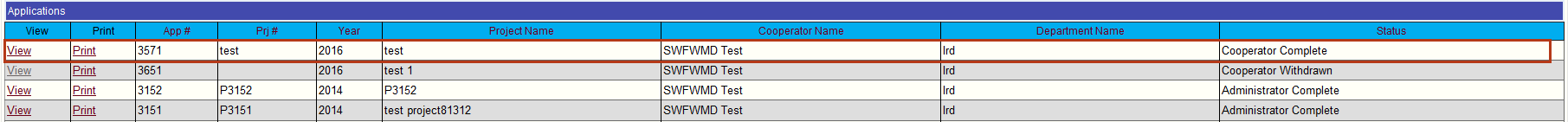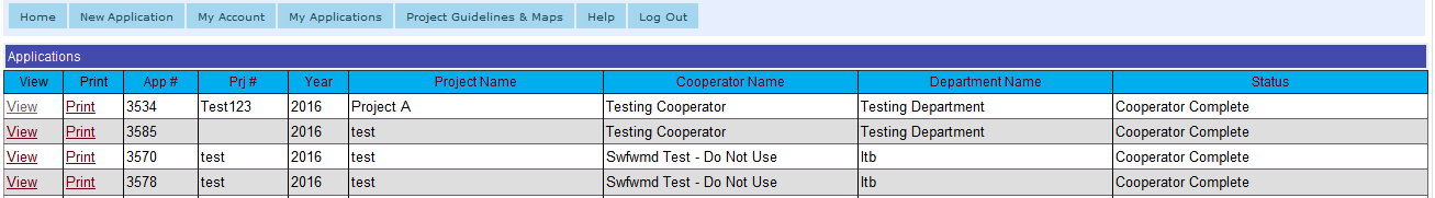 The Applications page, shown below, displays a list of applications that were submitted with your registered cooperator account, and the options available are categorized by Status: